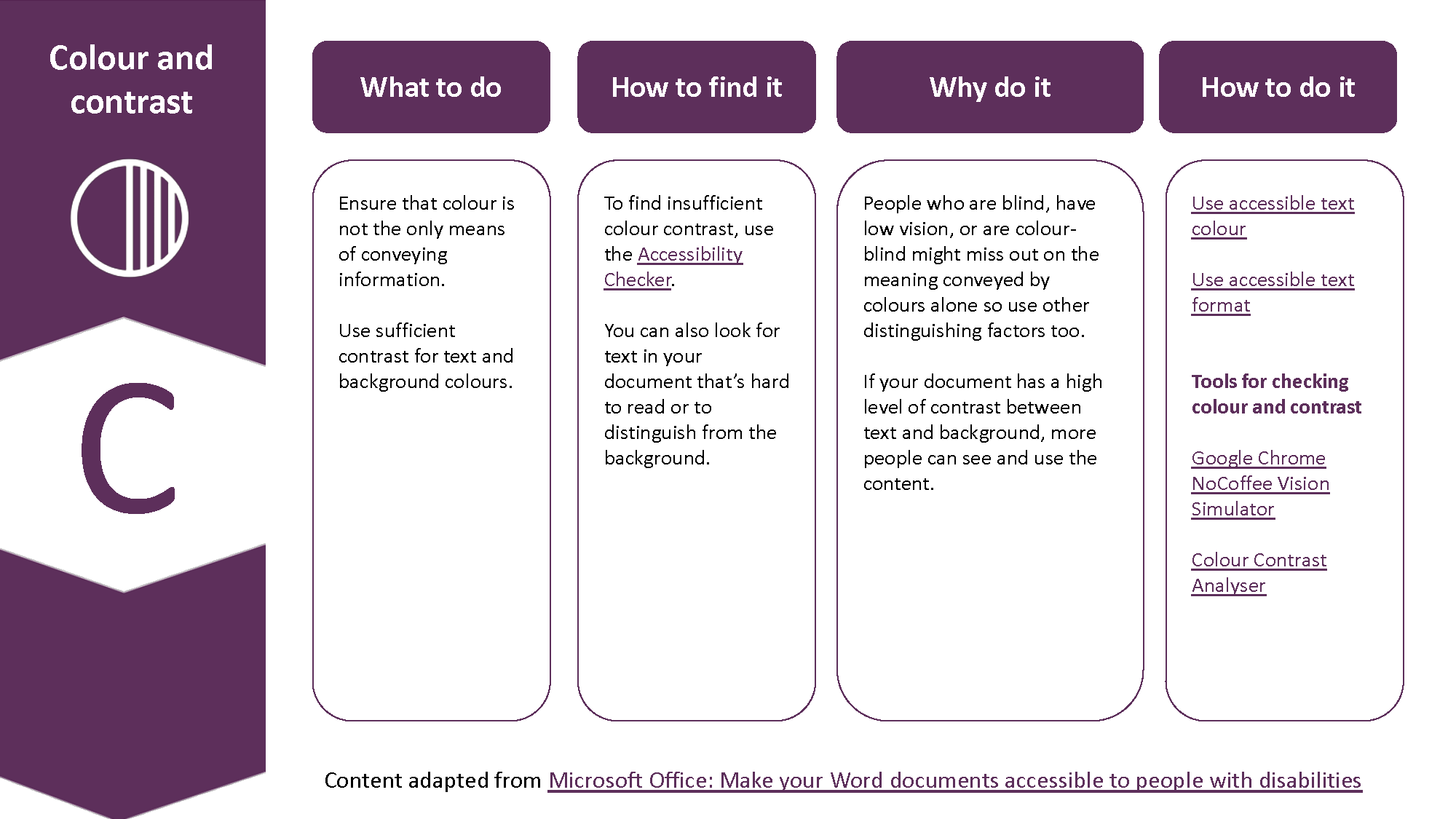 To find insufficient colour contrast, use the Accessibility Checker. You can also look for text in your document that is hard to read or to distinguish from the background.